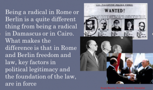 “Astfel, pentru chinezi, cea mai mare amenințare în prezent sunt tibetanii, uigurii și alte naționalități. În Irak, amenințarea este religia (sectarismul este un pericol mult mai mare decât insurgența). În Spania, Sri Lanka sau Turcia, amenințarea ia forma naționalismului separatist. (…) Unii dintre întemeietorii Israelului, printre care și Menachem Begin, care avea să devină prim ministru, au subminat violent un mandat al Ligii Națiunilor și au aruncat în aer Hotelul King David din Ierusalim, ucigând peste 90 de persoane. În zilele noastre, acest episod ar fi echivalentul uciderii trupelor ONU de menținere a păcii. Aceiași indivizi au mai ucis peste 100 de arabi, în mare parte bărbați vârstnici, femei și copii, în bine-cunoscutul masacru de la Deir Yassin. Însă nu doar israelienii sunt ipocriți. Noi toți suntem. Adevărul e că terorism este ce fac alții, nu ce facem noi. Poate că aceasta este singura trăsătură definitorie. De aceea America vede fundamentaliștii islamici ca făcând parte din Axa Răului, iar fundamentaliștii consideră că America este Marele Satan (..). Și trebuie să recunoaștem că atitudinile noastre se schimbă atunci când teroriștii au câștig de cauză. (…) Nelson Mandela, care timp de zeci de ani s-a aflat pe lista S.U.A a teroriștilor, a devenit președintele Africii de Sud și laureat al Premiului Nobel pentru Pace, precum și probabil cel mai celebrat om din lume. În plus, atitudinea noastră se schimbă atunci când terorismul ne afectează personal. În calitate de cetățean britanic, sunt foarte conștient de felul în care mulți americani, în conivență cu guvernul Statelor Unite, au dat bani – milioane de dolari – Armatei Republicane Irlandeze. Chiar avem memoria atât de scurtă? Chiar ne este moralitatea atât de superficială și definițiile terorismului atât de flexibile? Se pare că da.” (Ross, 2009, p. 232)